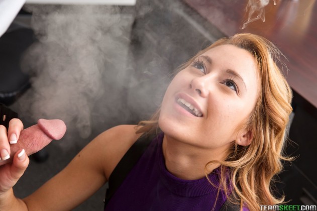 They shut the door and she got down on her knees in front of him. She pulled out his wiener and sucked it good while smoking. Then he carried her over to one of the desks and gave her cunilingus and slammed her hard. They kept fucking until he had to pull out and jizz all over her perfect behind.